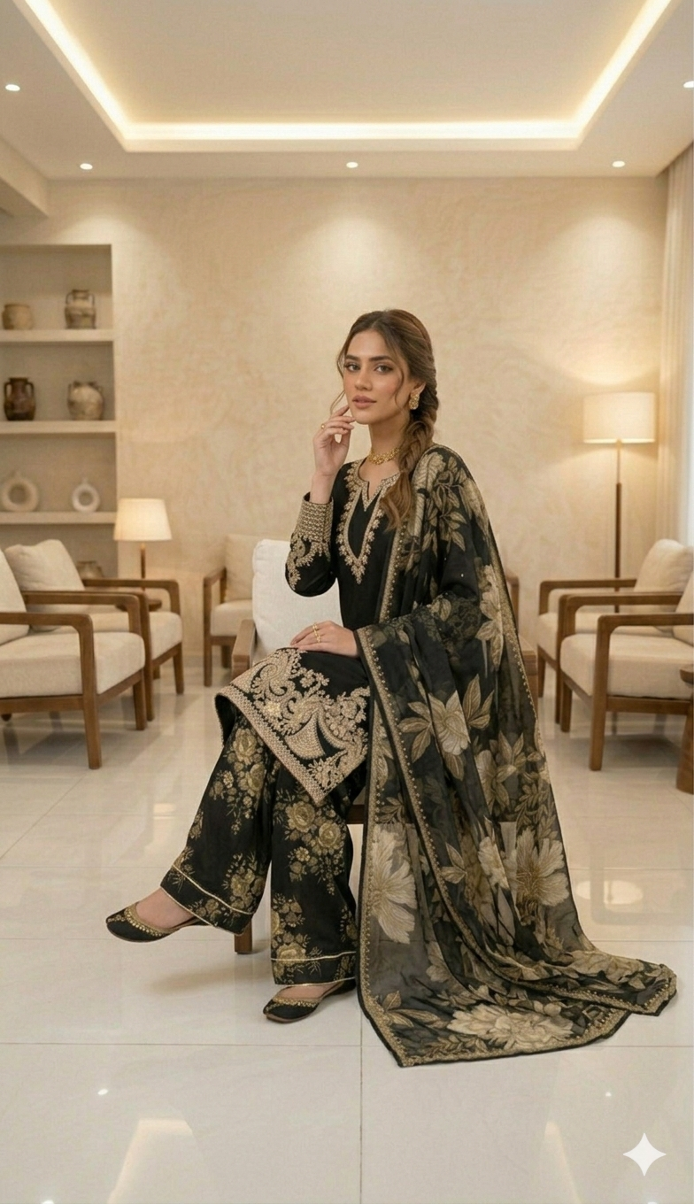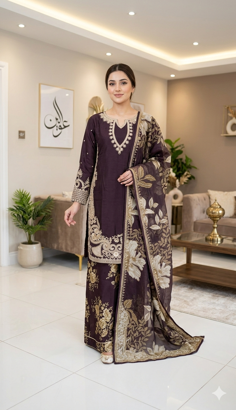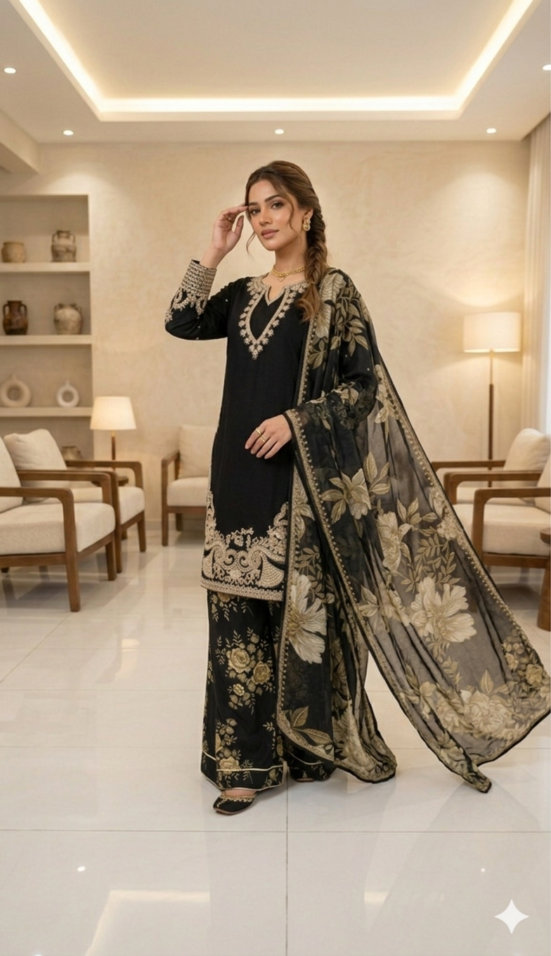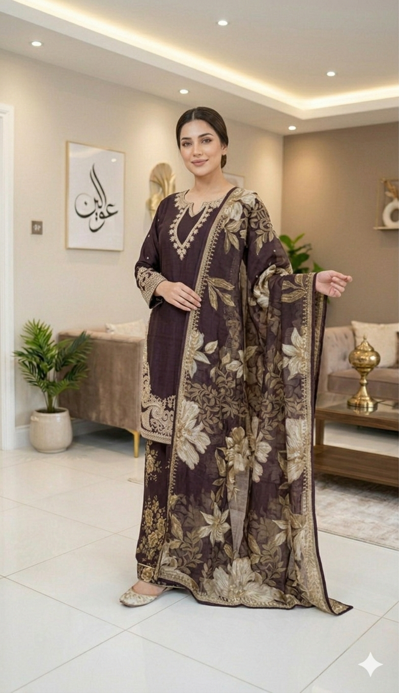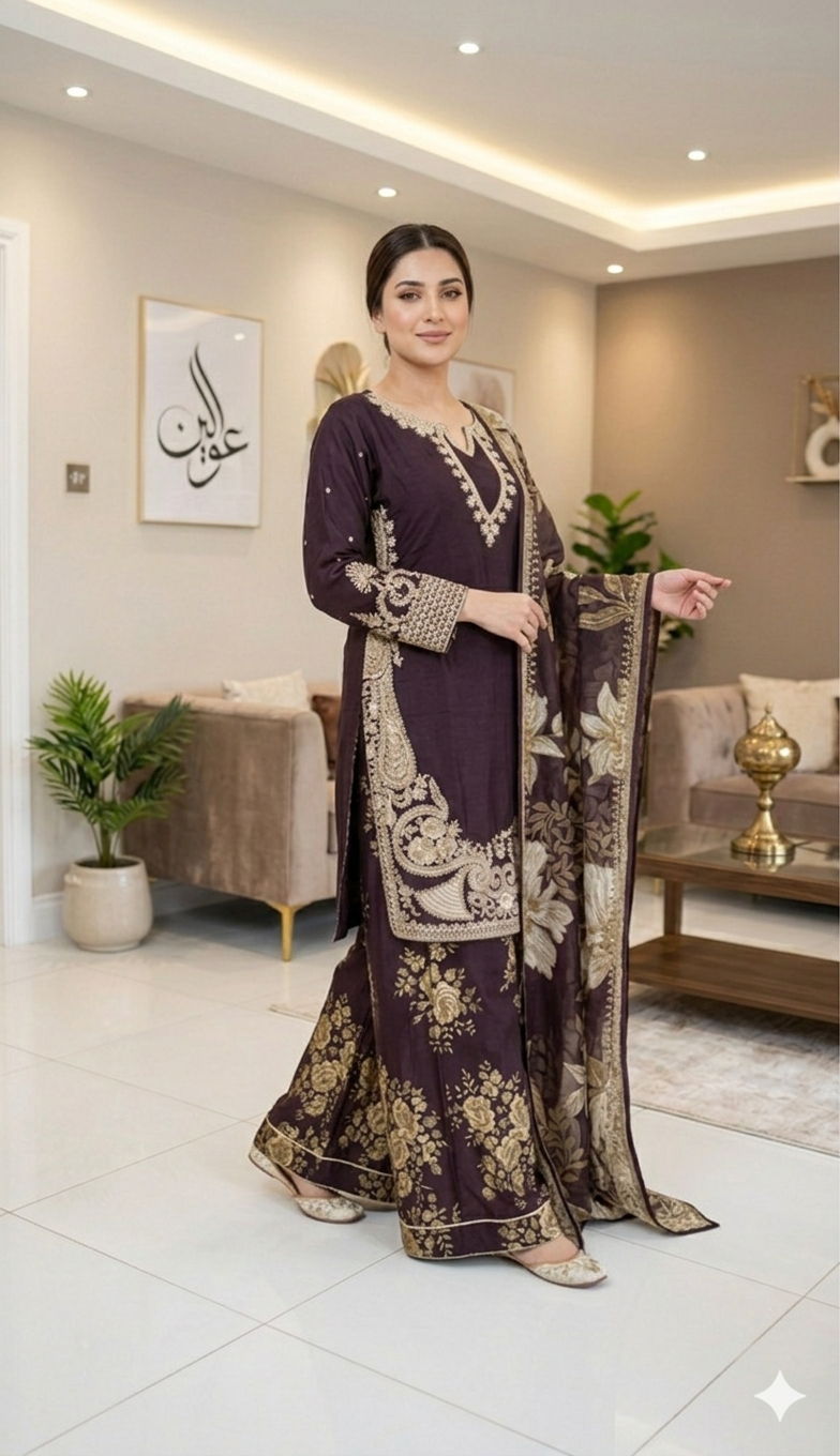 LAYLA is a luxurious and elegant Pakistani Plazzo design made of premium materials with deep embroidered & print work that is perfect for any occasion.
