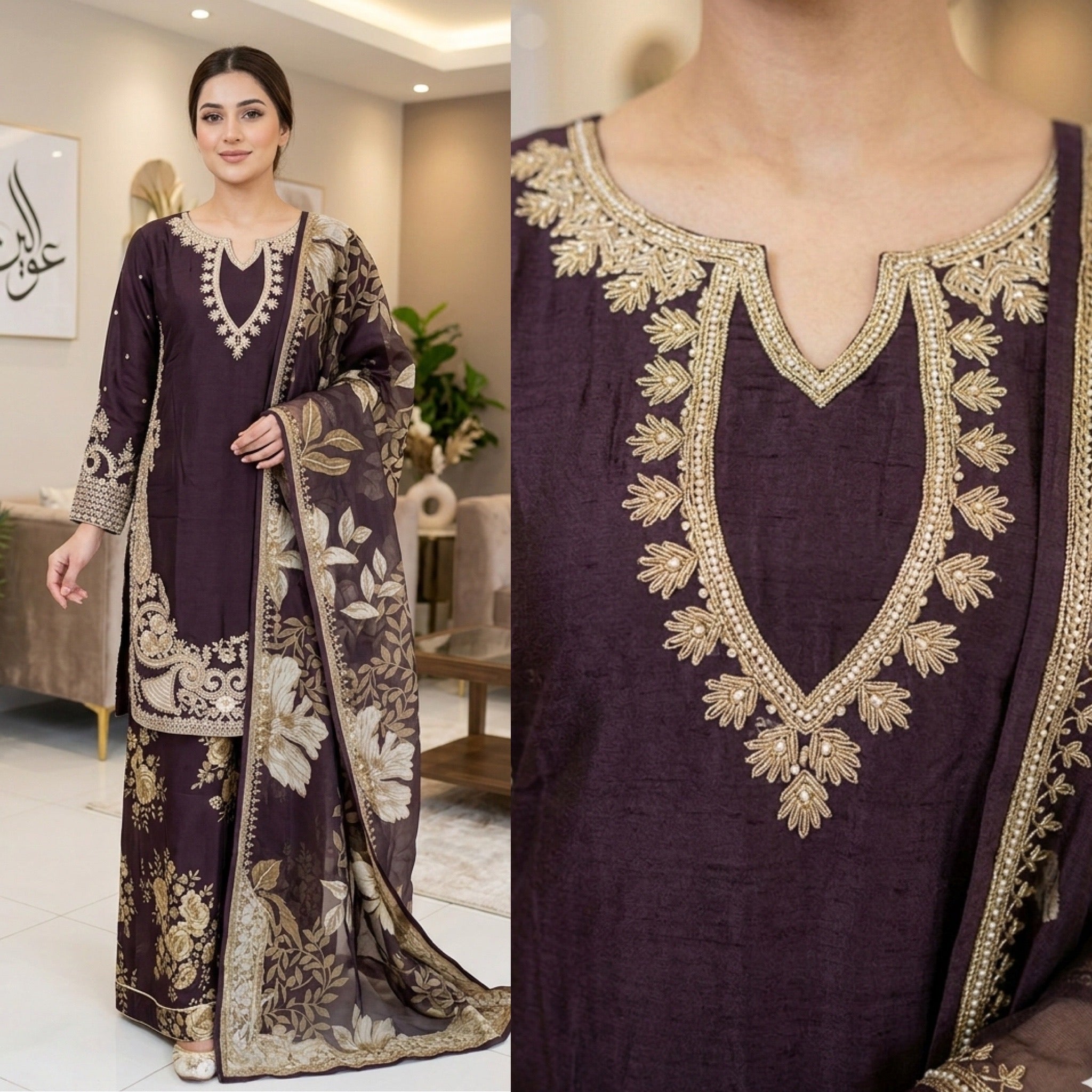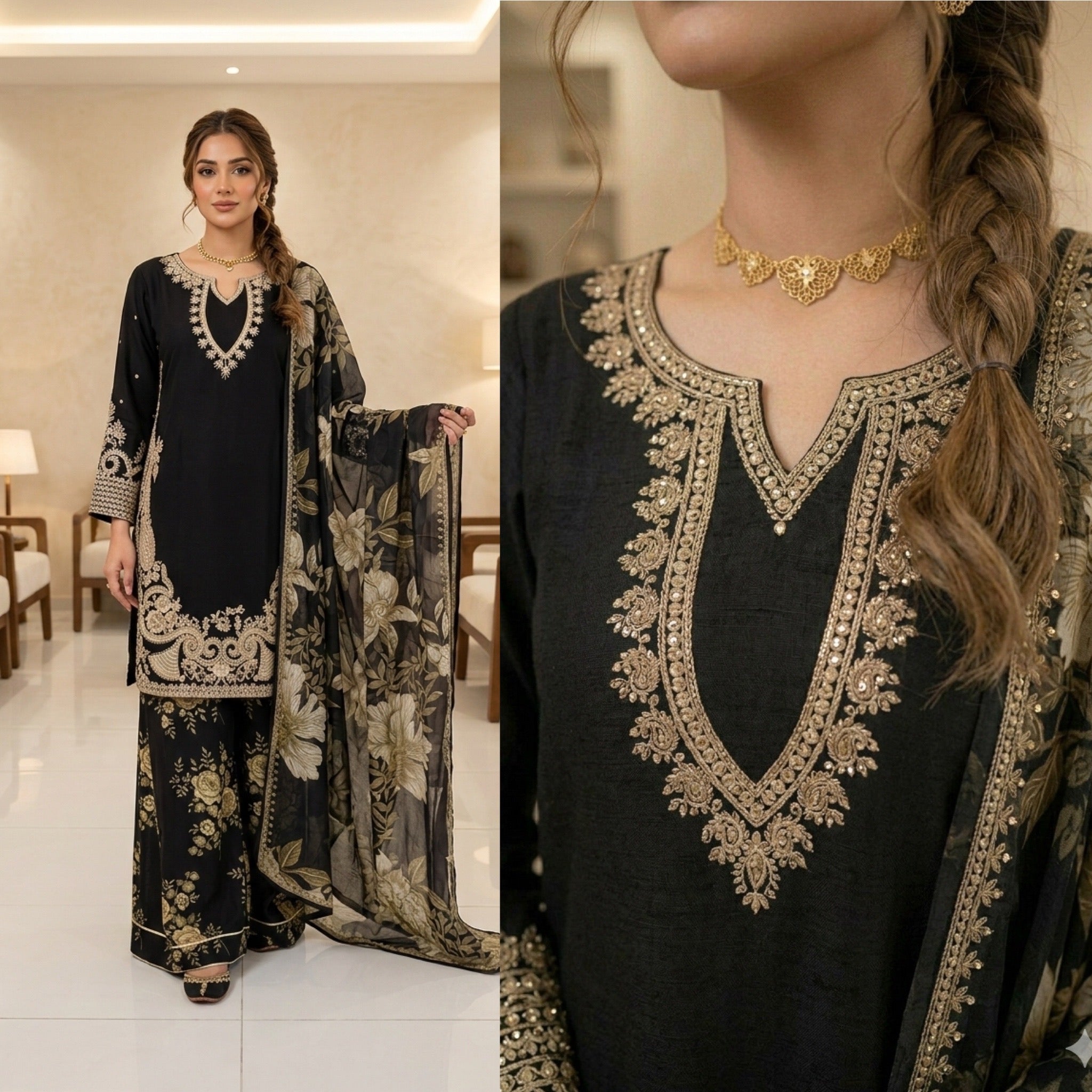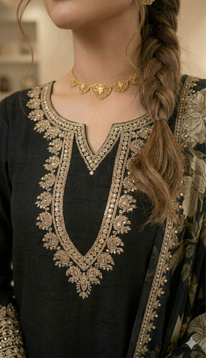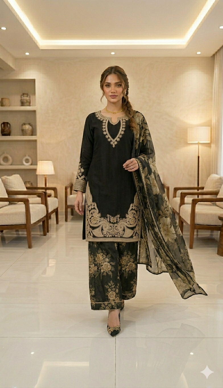 LAYLA is a luxurious and elegant Pakistani Plazzo design made of premium materials with deep embroidered & print work that is perfect for any occasion.