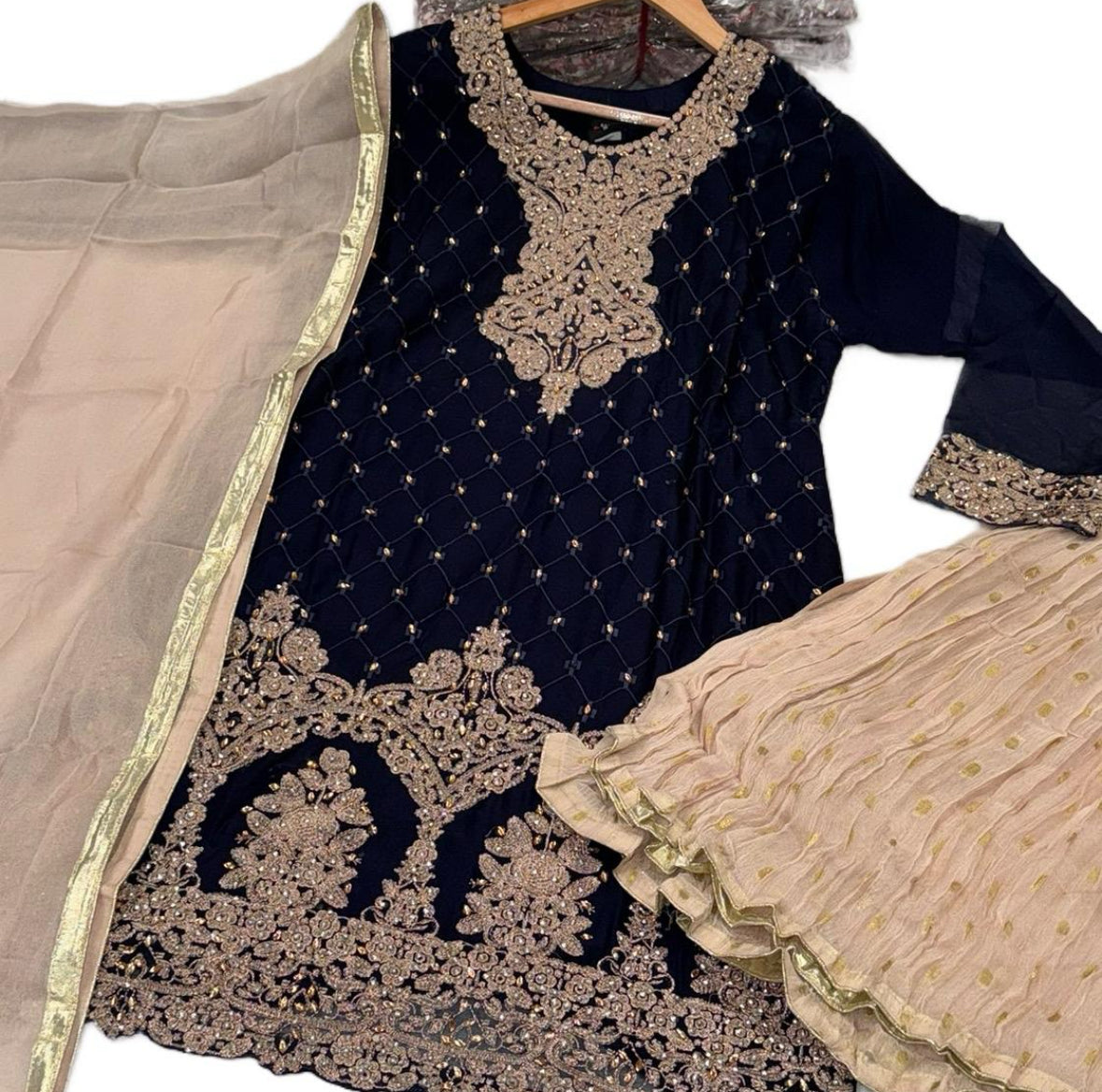 OREENA is a luxurious and elegant Pakistani shararah design made of pure chiffon with deep embroidery & stone work that is perfect for any occasion.