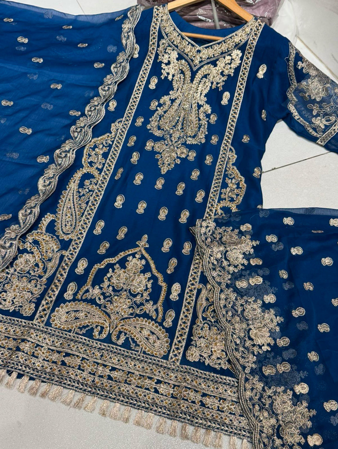 SUNDAS is a luxurious and elegant Pakistani shararah design made of pure chiffon with deep embroidered work that is perfect for any occasion.