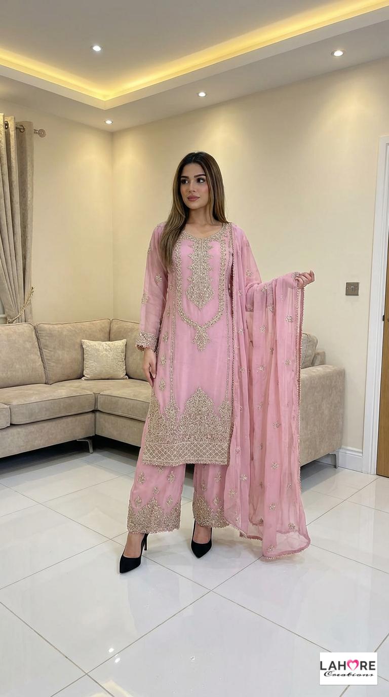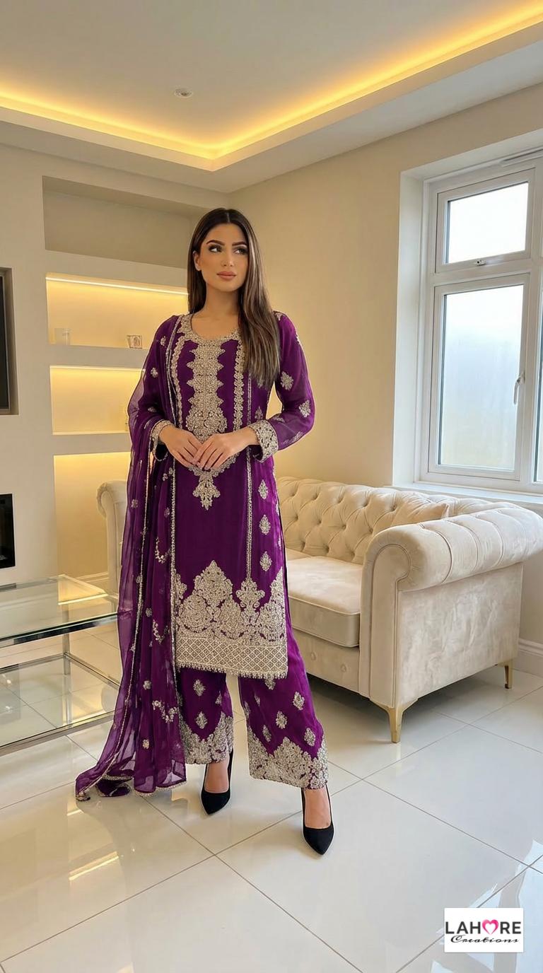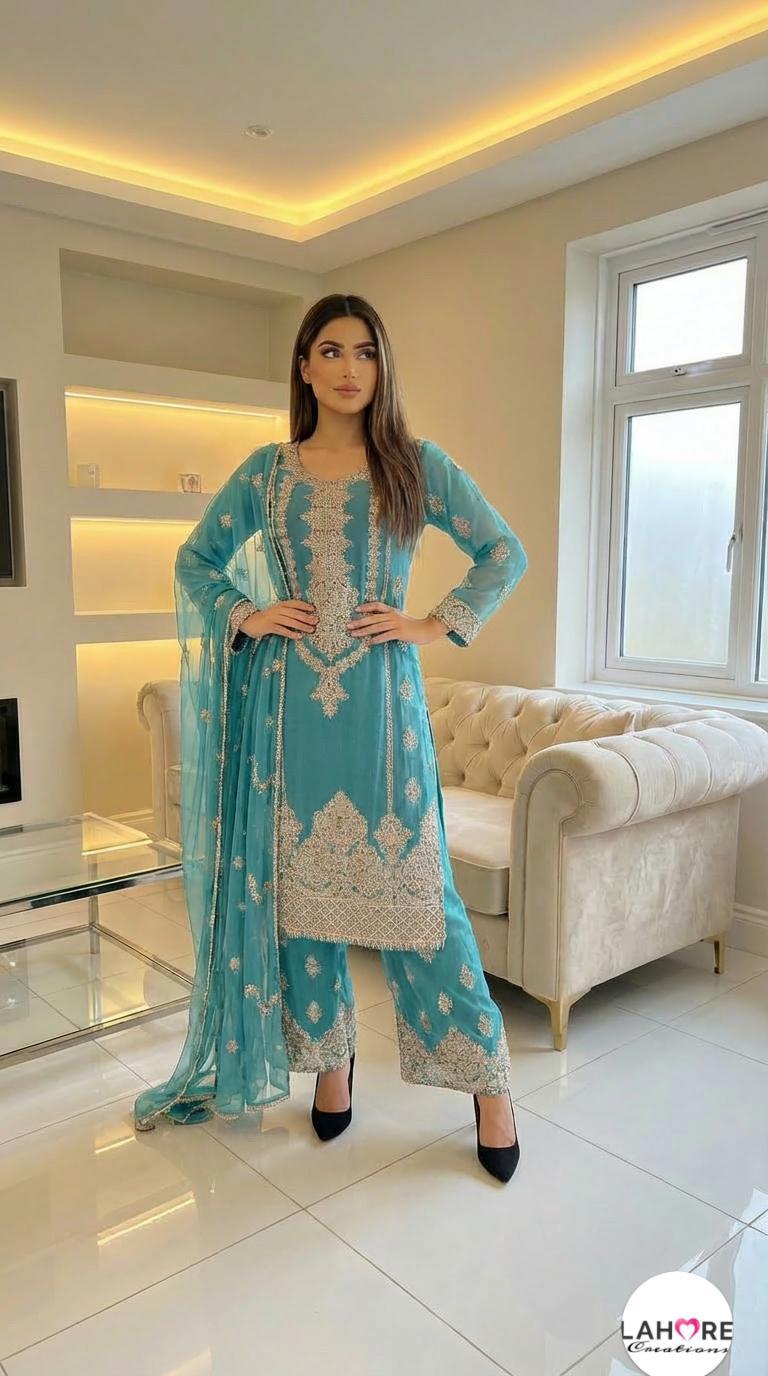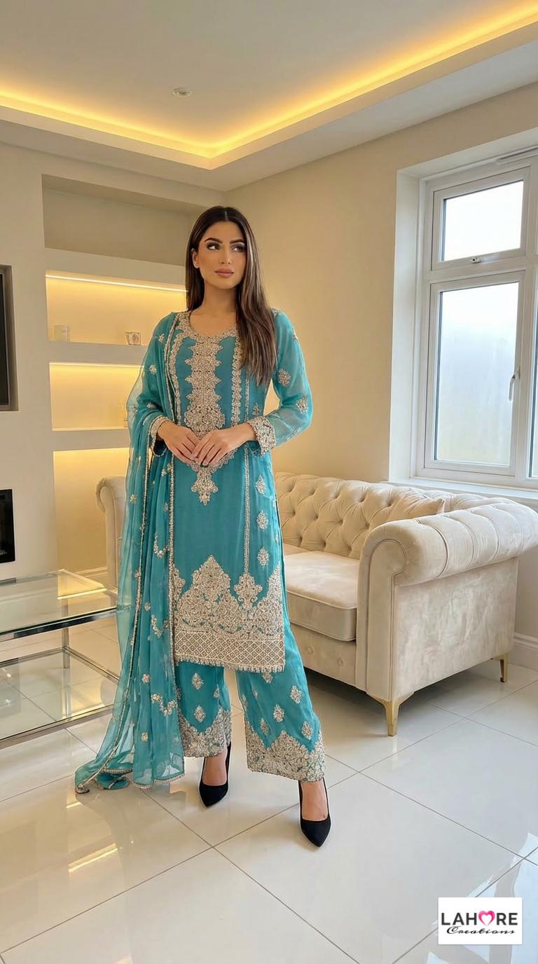 KYRA is a luxurious and elegant Pakistani Plazzo design is made of pure chiffon with deep embroidered work & very heavy stonework that is perfect for any occasion.