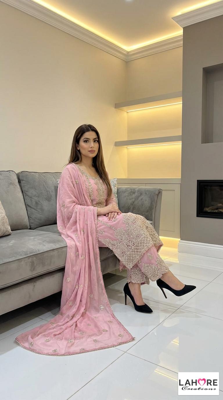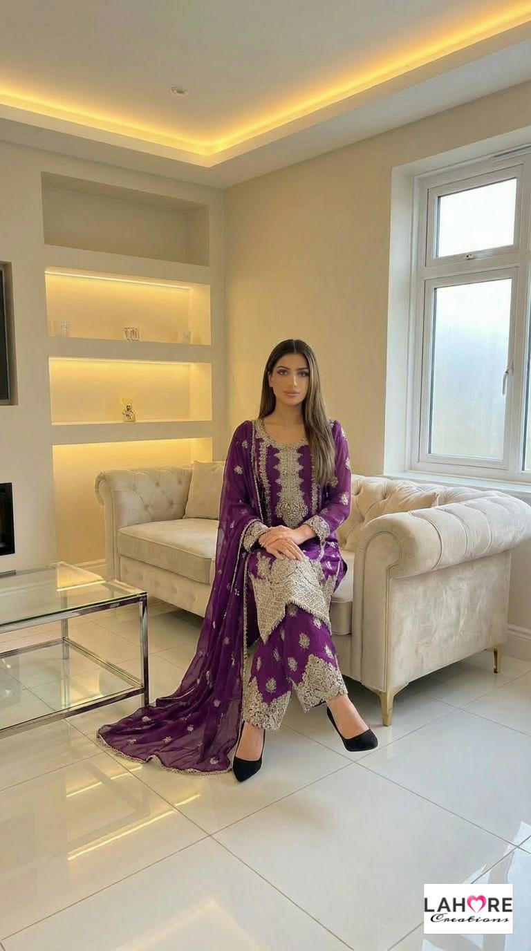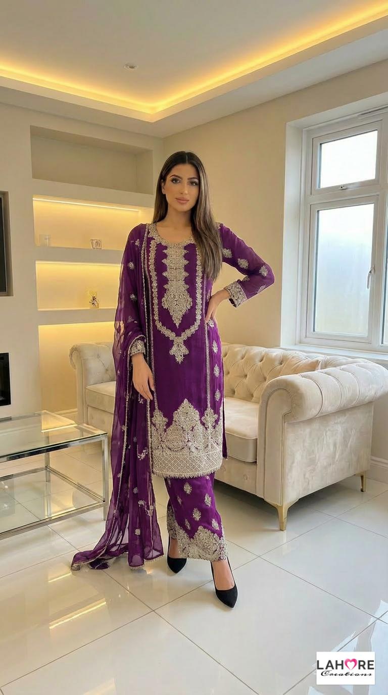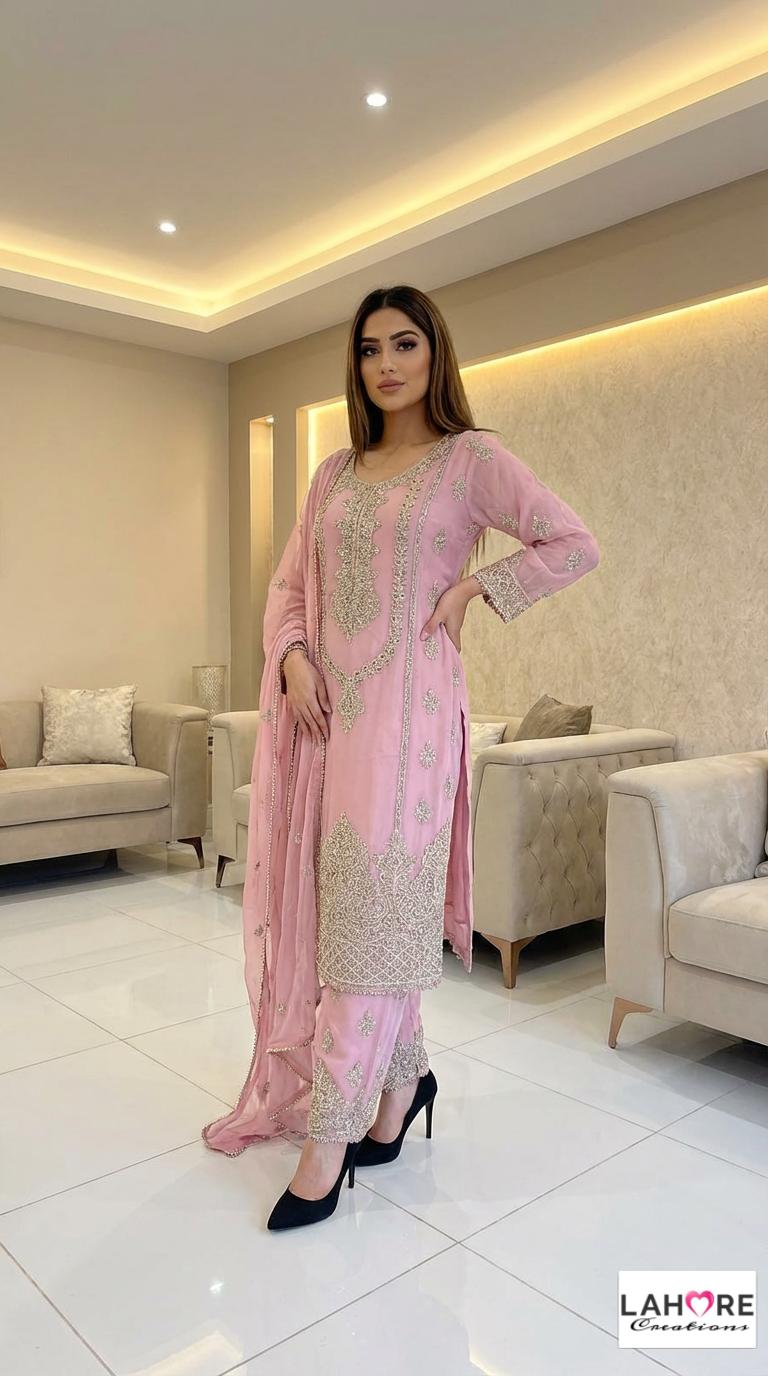 KYRA is a luxurious and elegant Pakistani Plazzo design is made of pure chiffon with deep embroidered work & very heavy stonework that is perfect for any occasion.