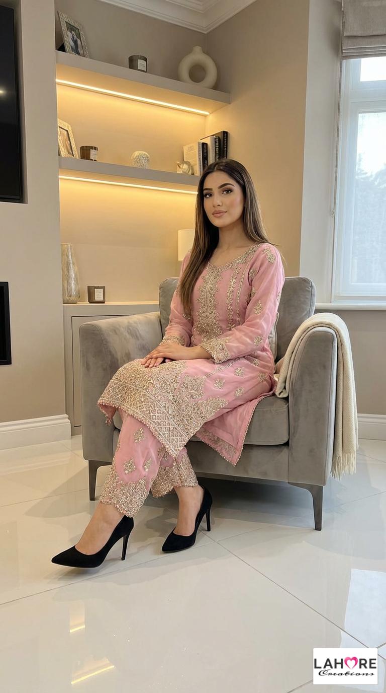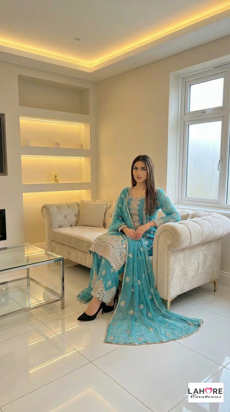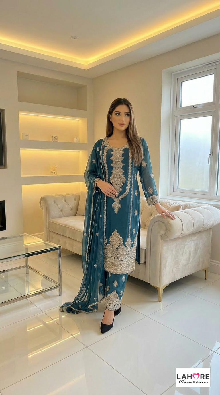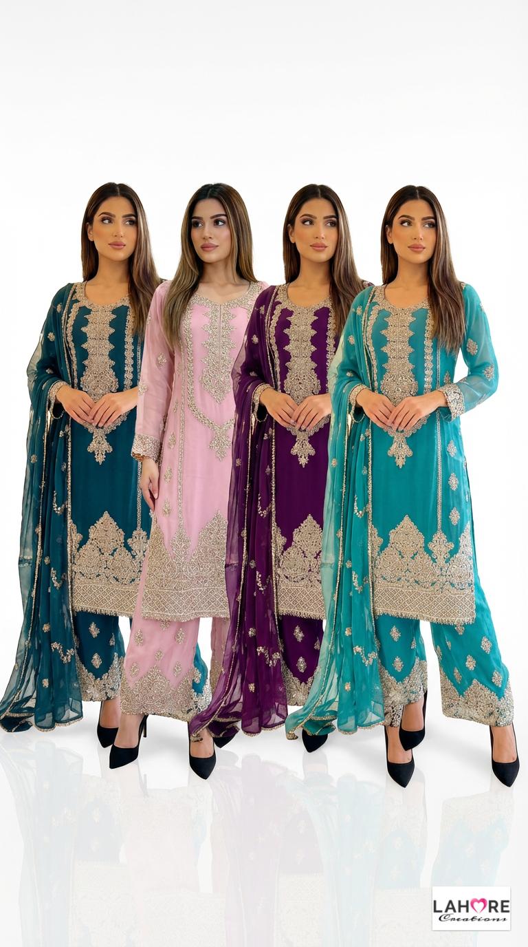 KYRA is a luxurious and elegant Pakistani Plazzo design is made of pure chiffon with deep embroidered work & very heavy stonework that is perfect for any occasion.