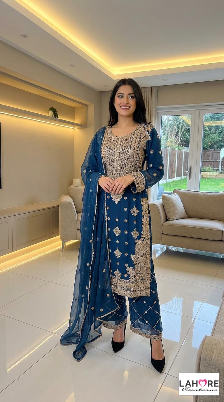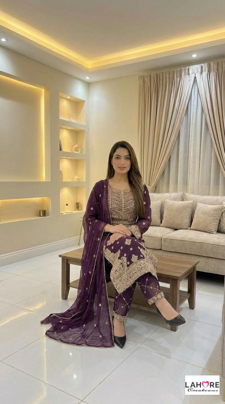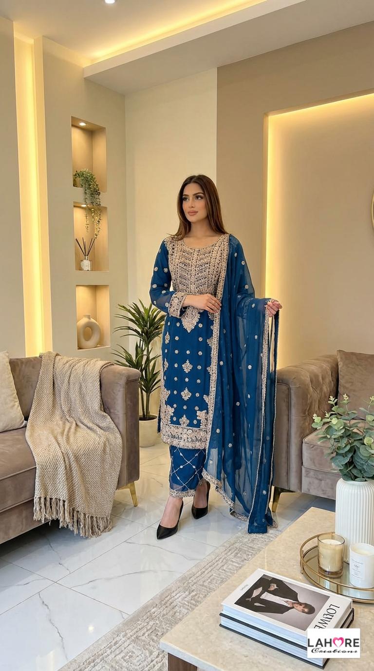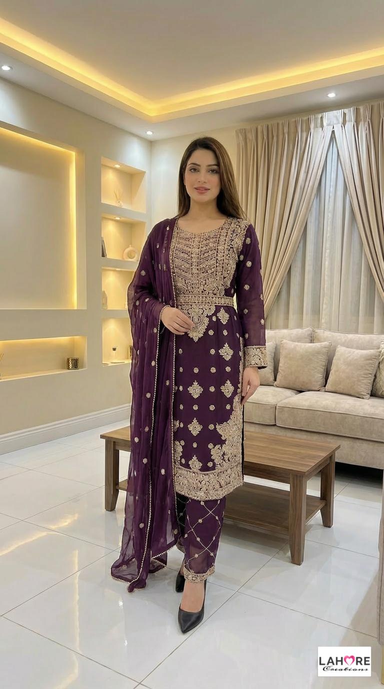 LEIYA is a luxurious and elegant Pakistani waist belt design which is made of pure chiffon with deep embroidered work & very heavy stonework that is perfect for any occasion.