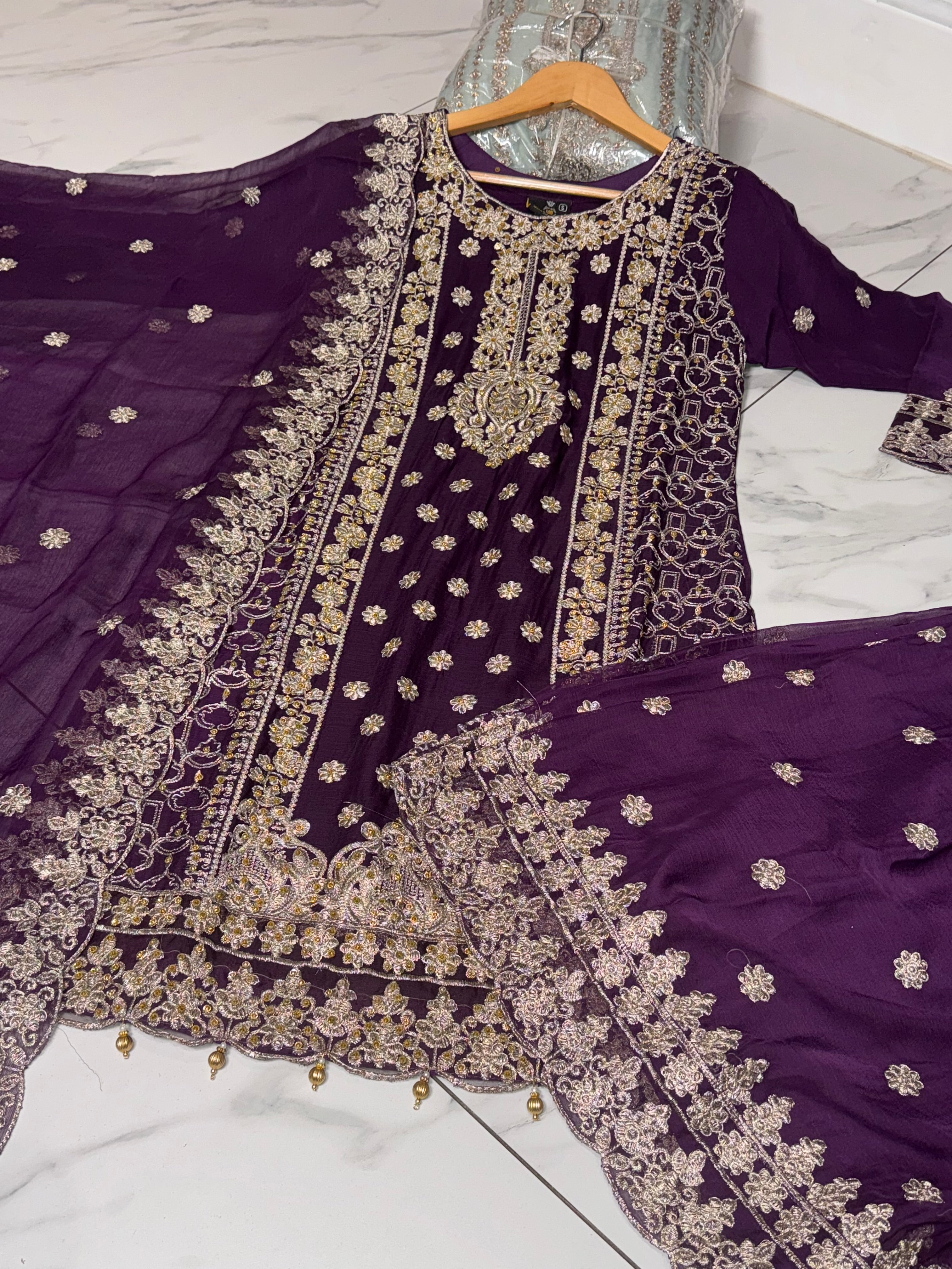 SHAKIRA is a luxurious and elegant Pakistani shararah design made of pure chiffon with deep embroidered work that is perfect for any occasion.