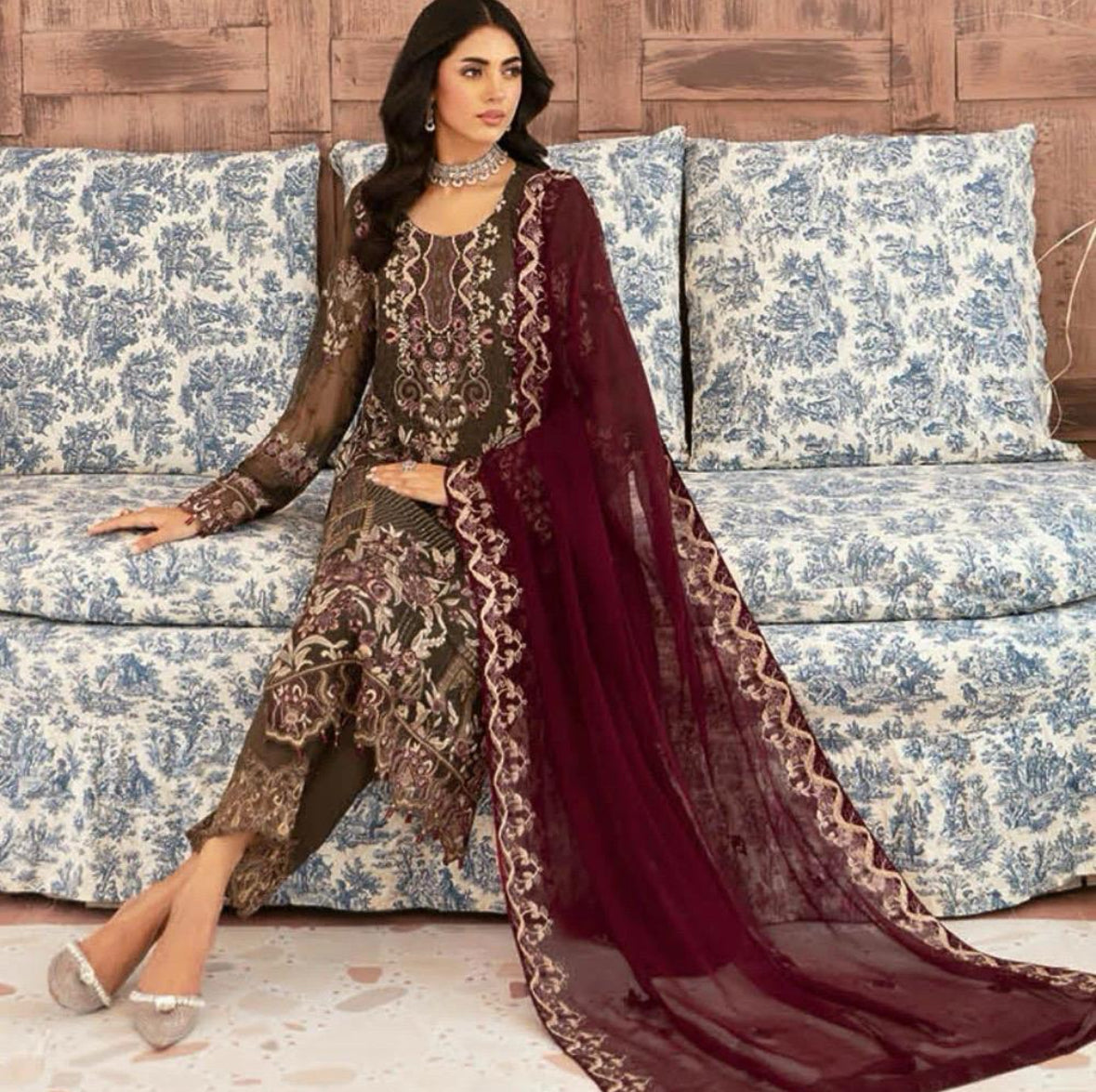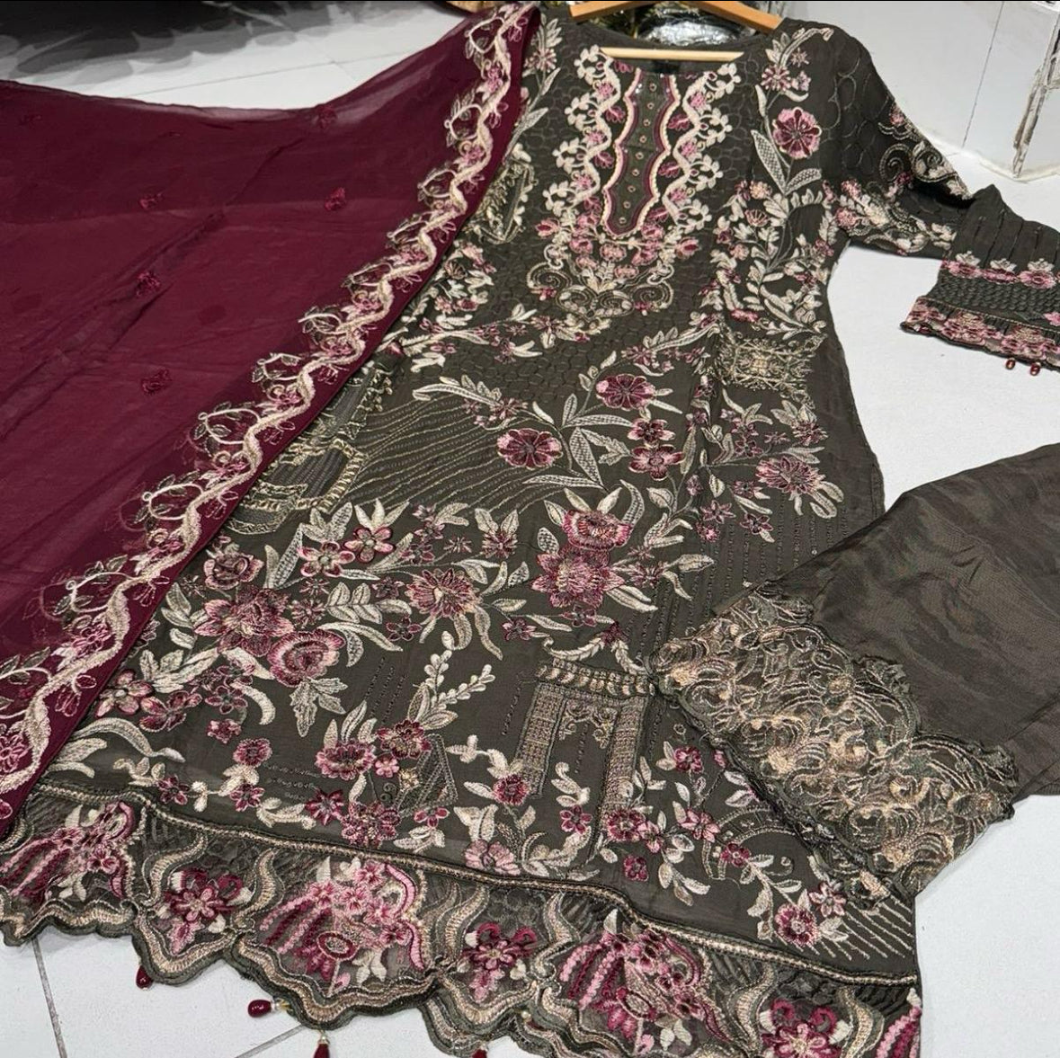 Celebrate grace with this ensemble featuring embroidered chiffon front, back, and sleeves, complete with sequins and lace. Highlights include an organza lace daman, a beautifully embroidered chiffon dupatta, and raw silk trousers with organza lace."