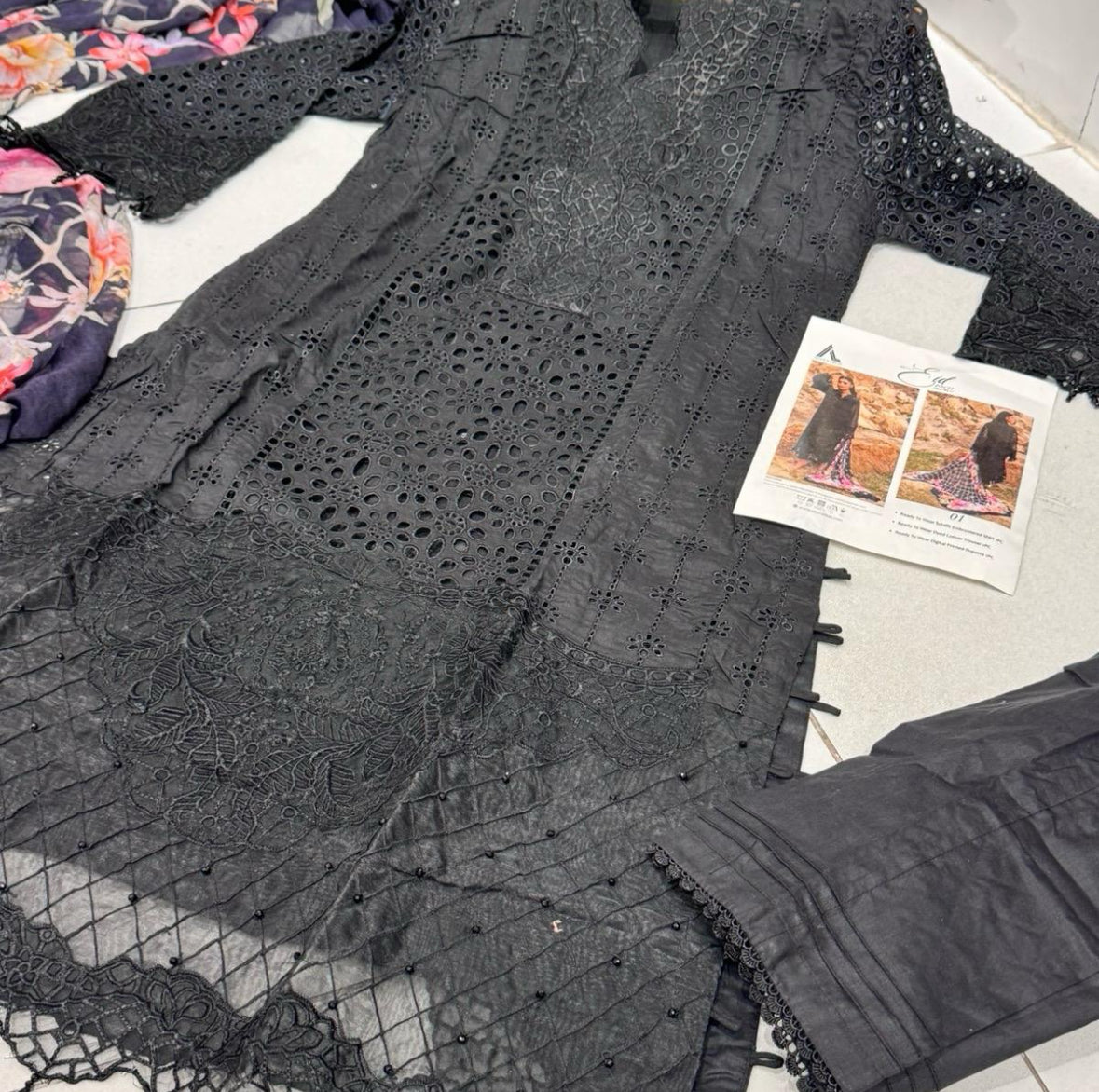 A Heavily embroidered Schiffli kameez design complimented with a lovely contrasting print work Duppata and a straight trouser.