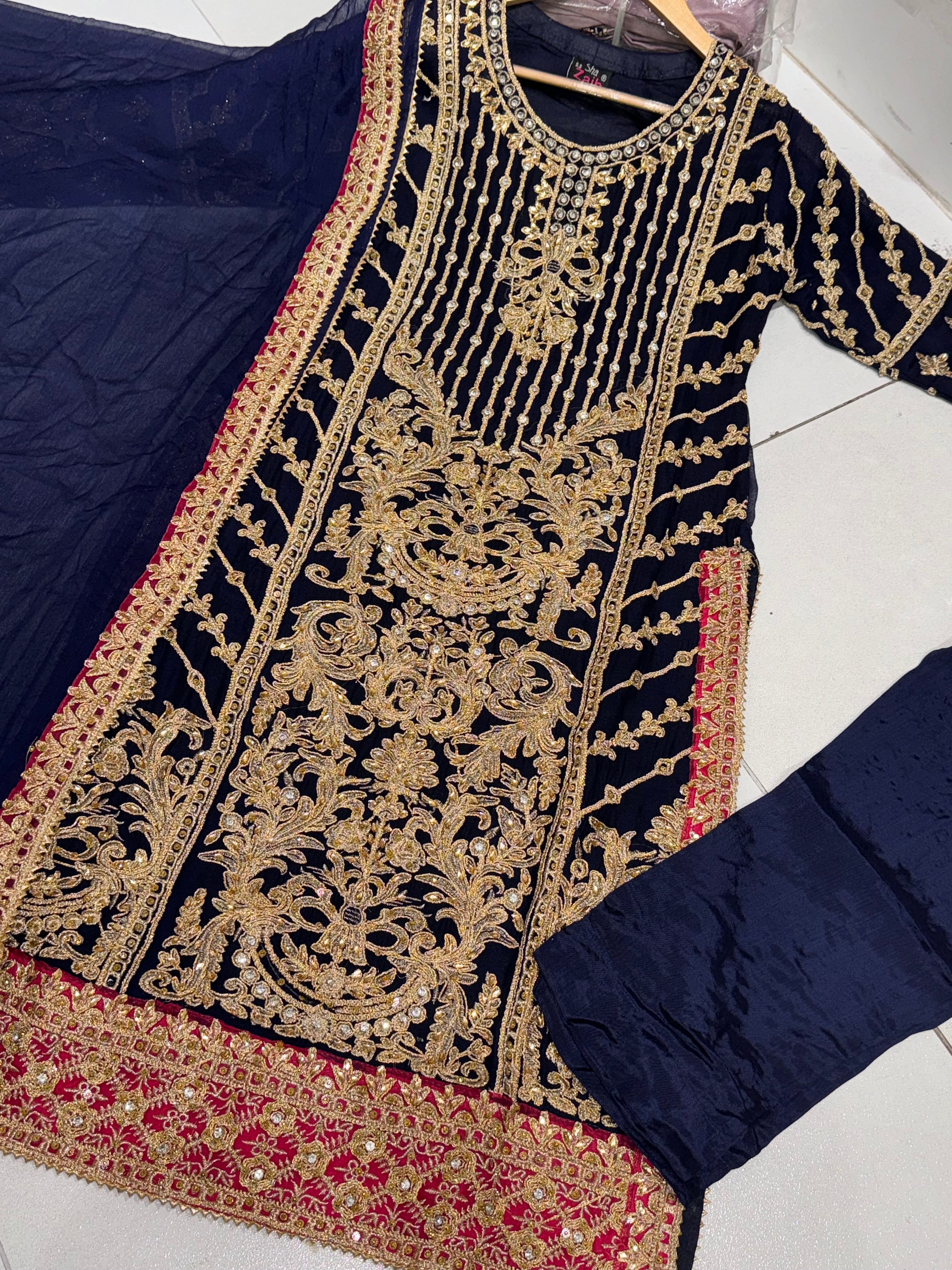 Coming along on a lovely chiffon fabric with handwork ands stone work, with a straight trouser and an elegantly soft chiffon scarf..